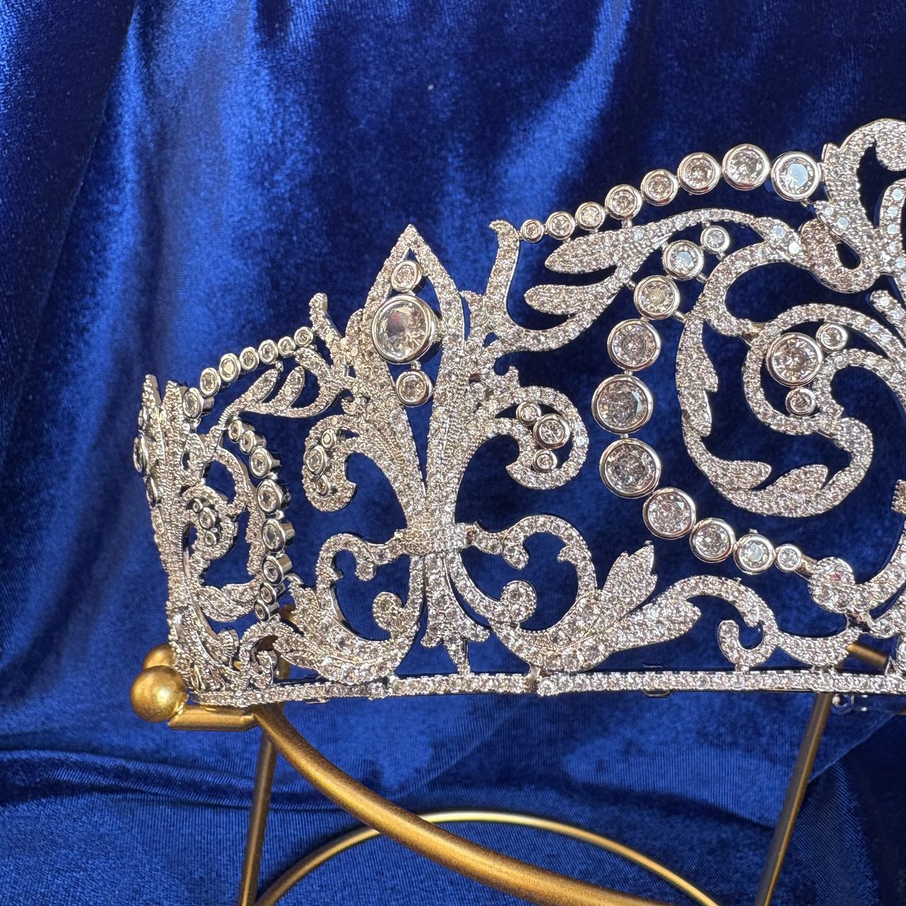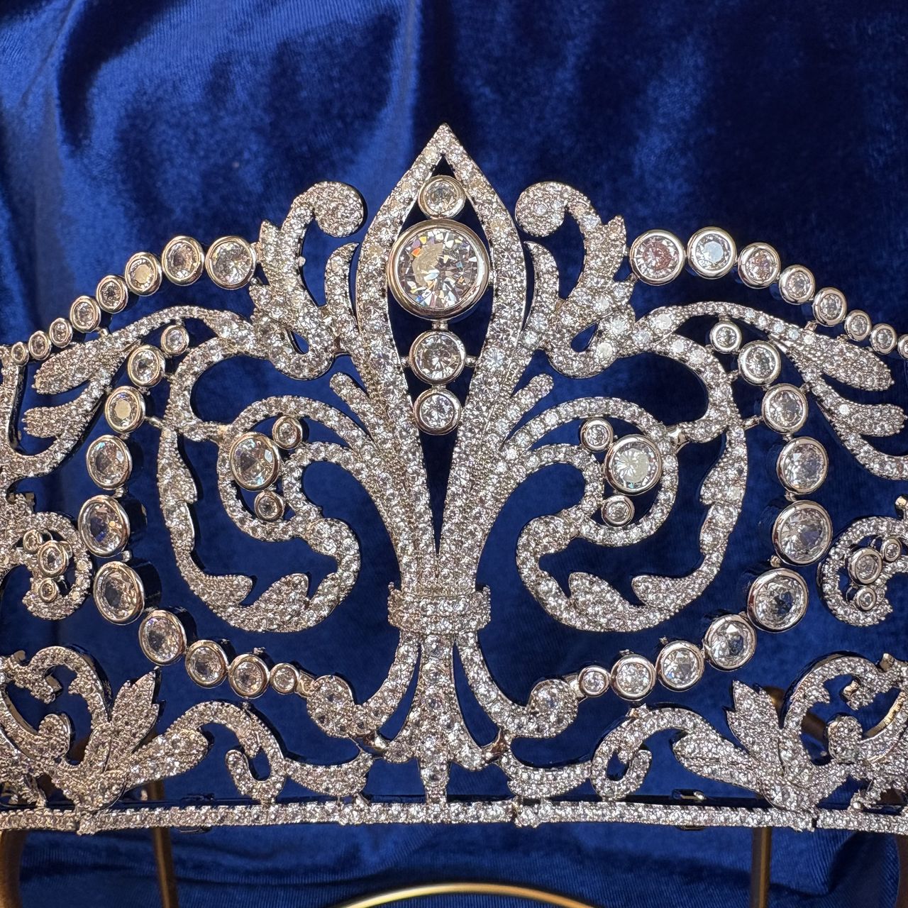 The diadem is a sophisticated architectural tribute to the House of Bourbon, utilizing the fleur-de-lys, the dynasty's heraldic emblem, as its central motif. The technical execution of the piece includes:
